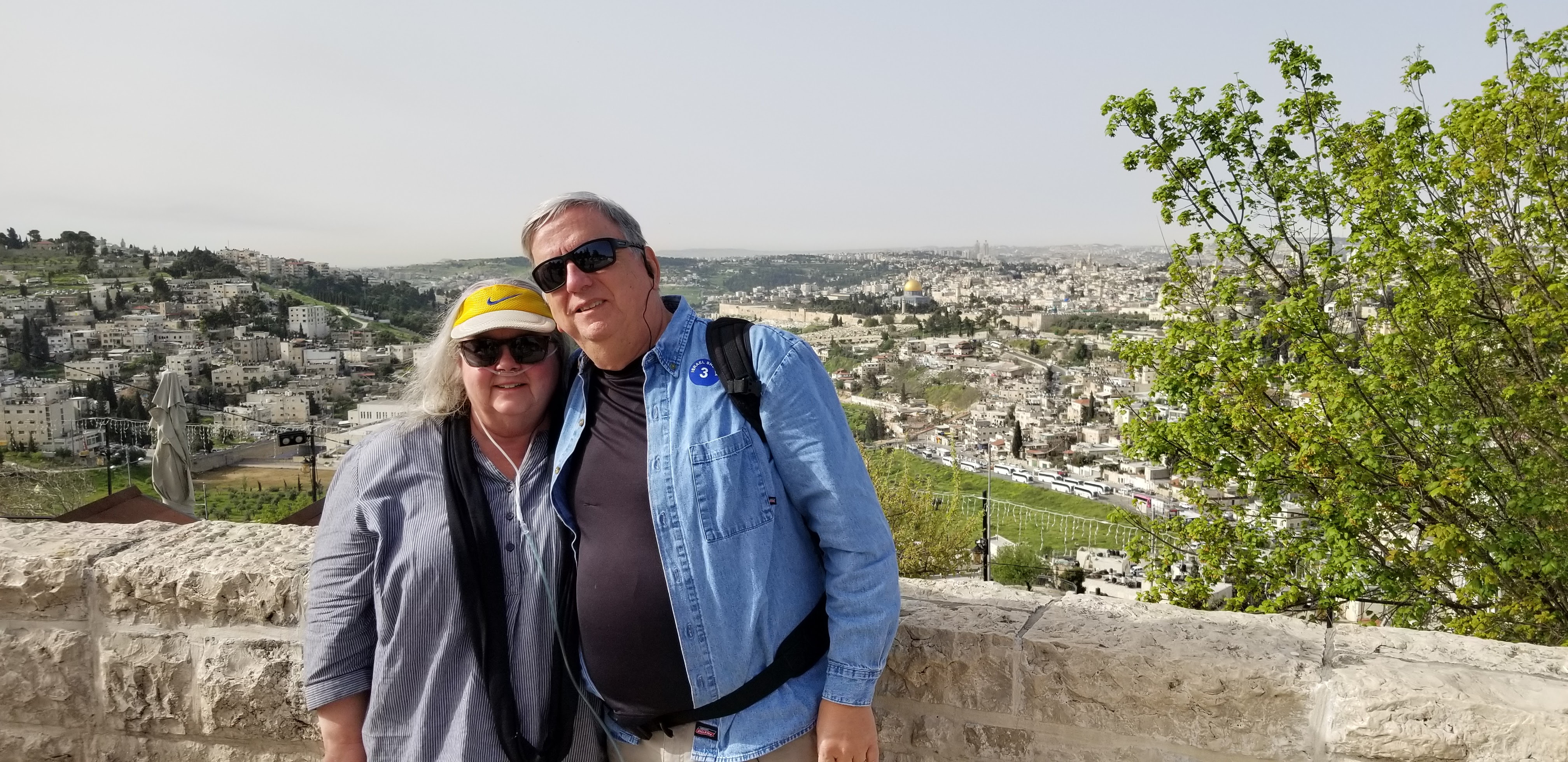 | Somebody pinch me! It's hard to believe we're actually in Jerusalem. Just off the DH's left shoulder, you'll see the golden Dome of the Rock and the Al Aqsa Mosque, previously the site of Solomon's Temple, and the ancient city walls that enclosed the Holy City. Our waiter Aswi and his assistant Dani were able to leave the ship long enough to pray in the mosque and their entire families back in Indonesia feel blessed by their experience. Jerusalem is holy to all three of the great monotheistic religions--Judaism, Christianity, and Islam. |